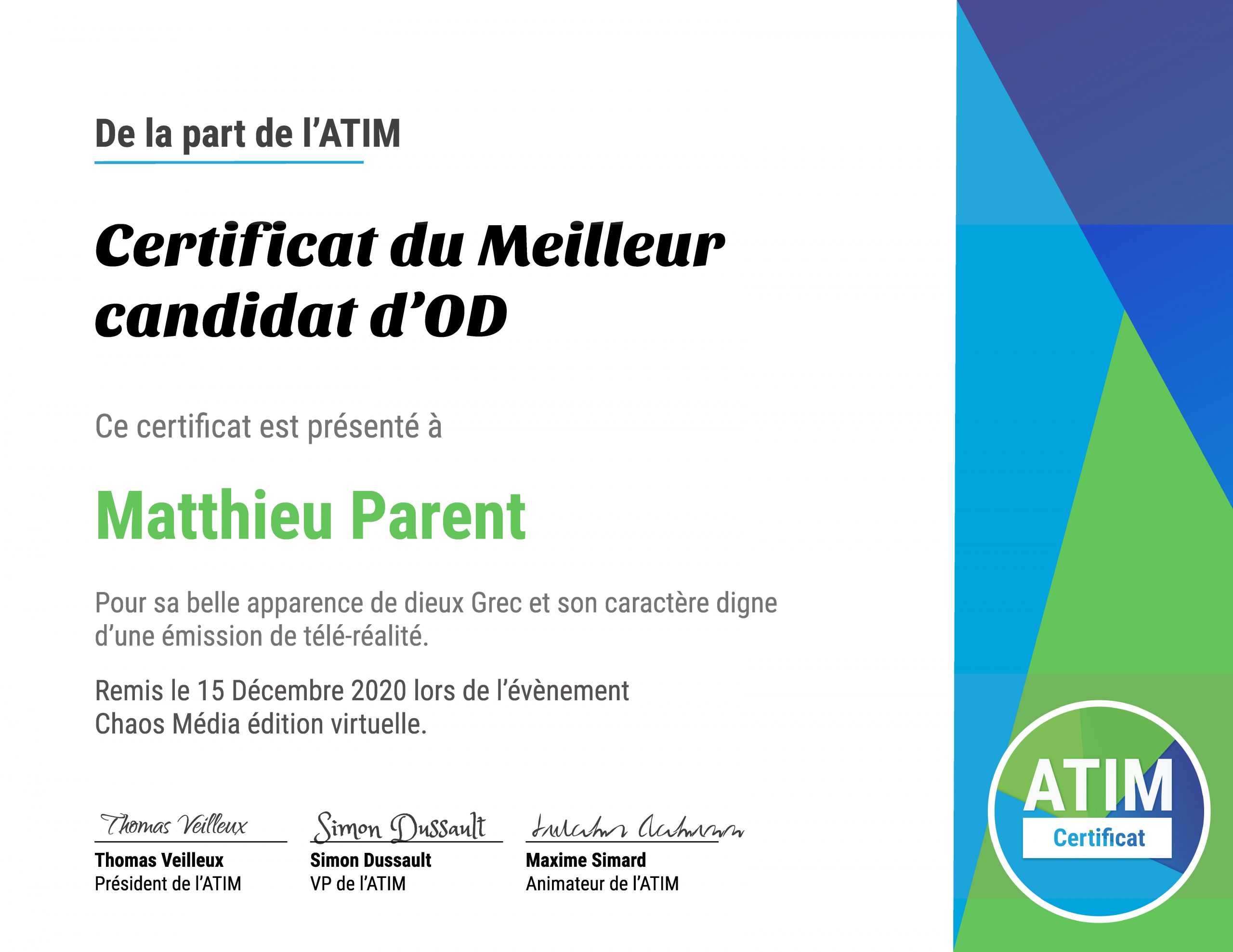 - Le/la meilleur(e) candidat(e) à Occupation Double: Matthieu Parent