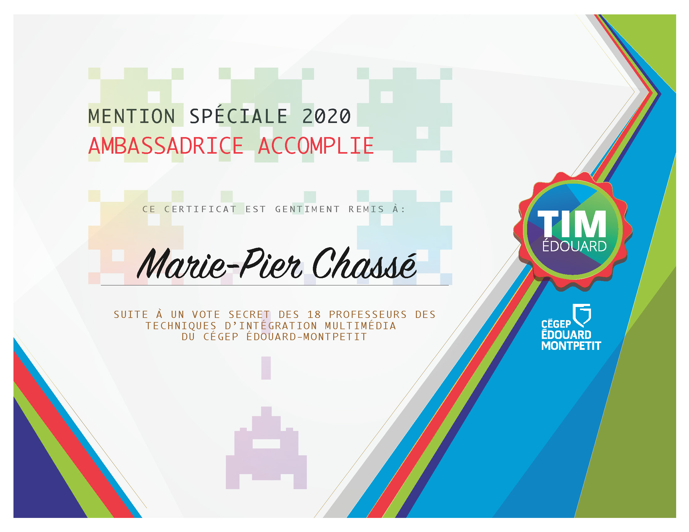 - Ambassadeur accompli, remis par Martin Gélinas: Marie-Pier Chassé