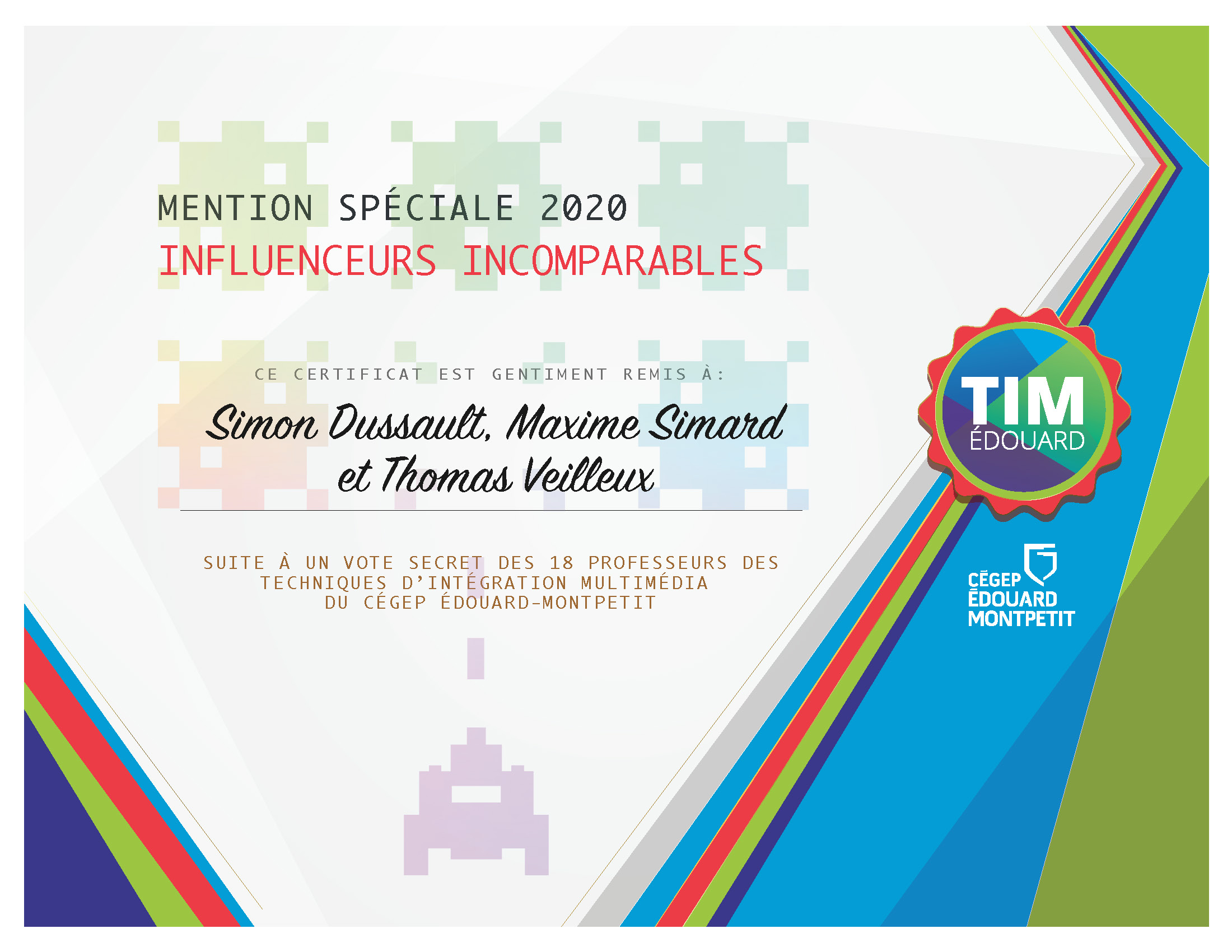- Influenceur incomparable, remis par Alexandre Donato: Thomas Veilleux, Simon Dussault et Maxime Simard