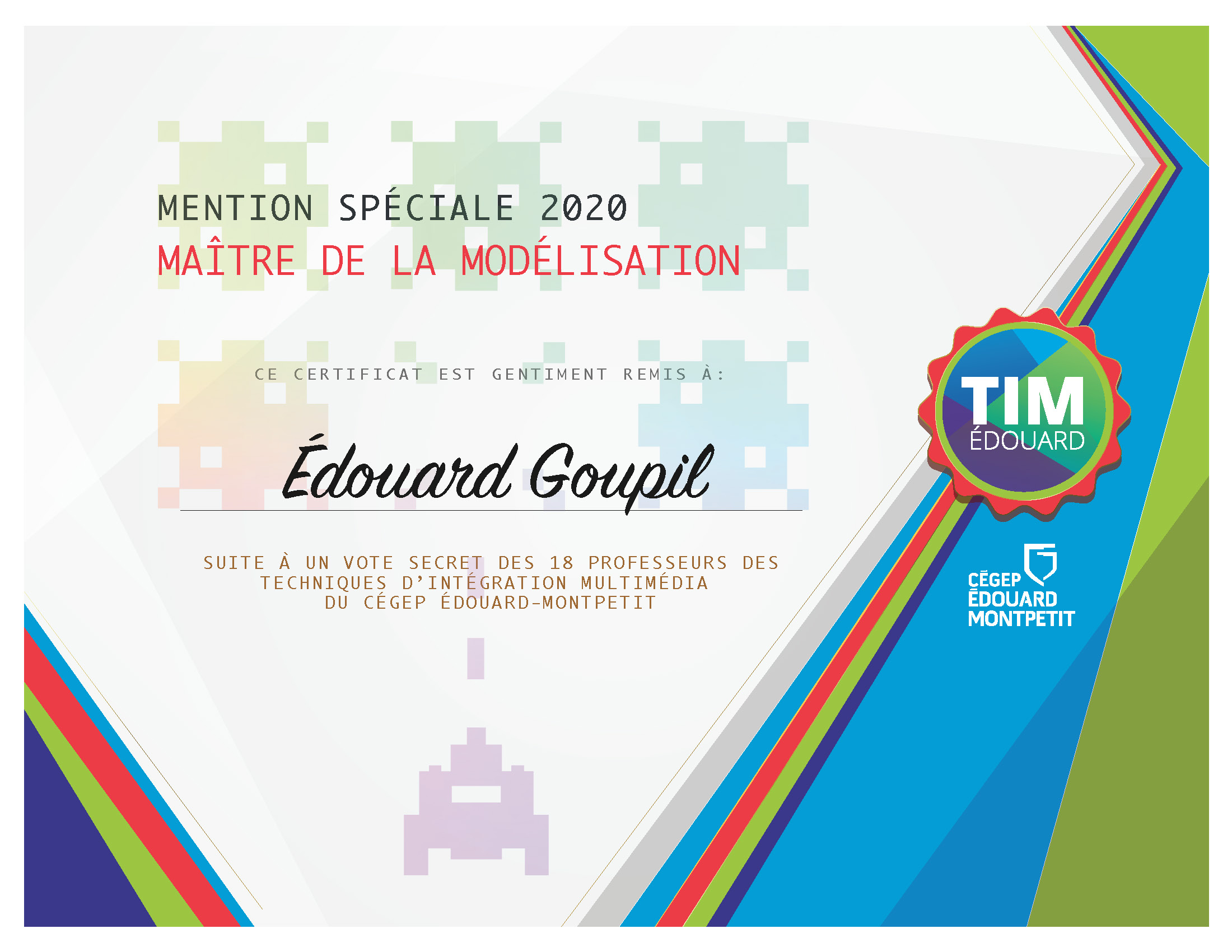 - Maître de la modélisation (3D), remis par Louis-Marie Dussault: Édouard Goupil