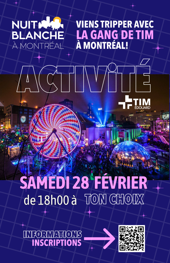 Nous vous invitons, cher TIMeux, a vous joindre au groupe de TIM qui participera à la nuit blanche. Quel meilleure façon d’apprécier un événement incroyable tel que celui-ci qu’accompagné de vos professeurs et camarades de classe préféré.